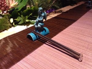 - Es gibt wunderschöne Stäbchen und teils sehr kostbare. Vergleichbar mit unserem Silberbesteck gibt es auch hier eine Art „Familiensilber“. Die auf dem Bild haben z.B. Kristalle an den Enden – das Foto habe ich in einem sehr schönen buddhistischen Restaurant in Peking gemacht (die Bepflanzung ist in der Mitte des Tisches und natürlich so niedrig, dass man das Gegenüber gut sehen kann)
